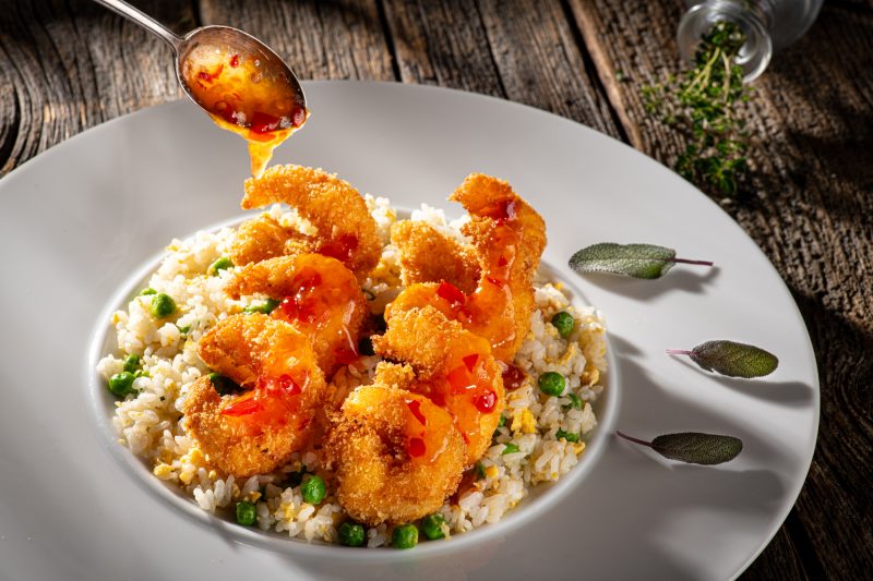 Creveți, panko, ou, faina alba, orez, mazare, ulei de susan, susan, sare, piper, sos sweet chilly, ulei.