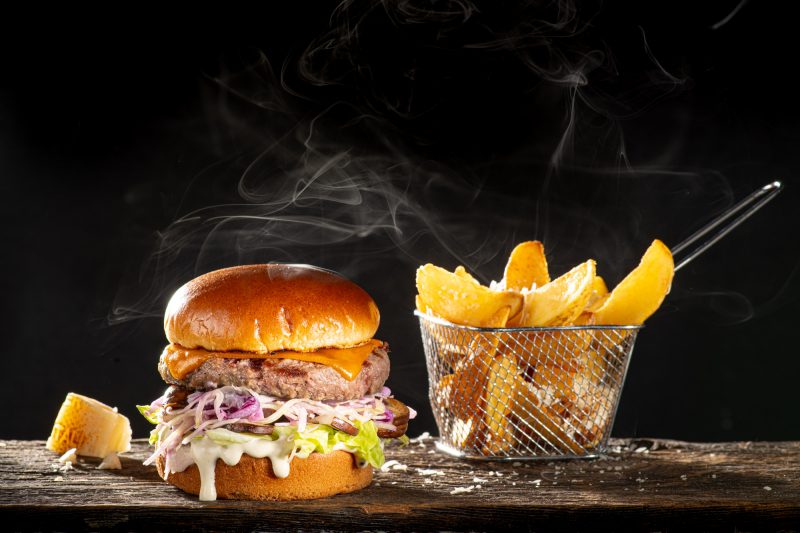 Chiflă burger, carne de vită, ciuperci, salată iceberg, salată coleslaw, maioneză cu usturoi, jalapeno, cartofi cu parmezan, oțet balsamic, ulei extravirgin, sos worchester.