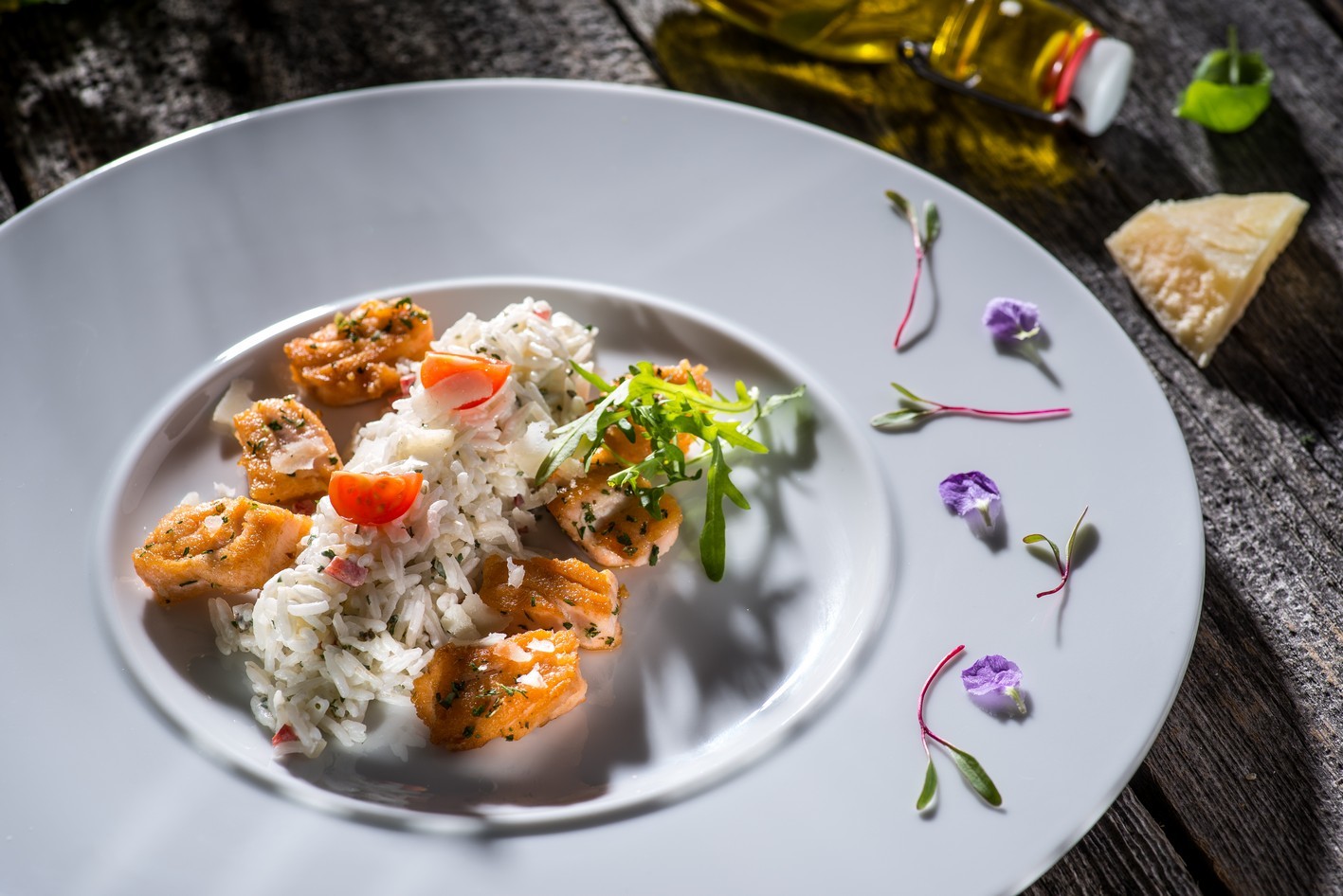 Risotto, panna, somon, parmezan, rucola, lămâie, ardei, ceapă, usturoi, pătrunjel, vin alb, usturoi